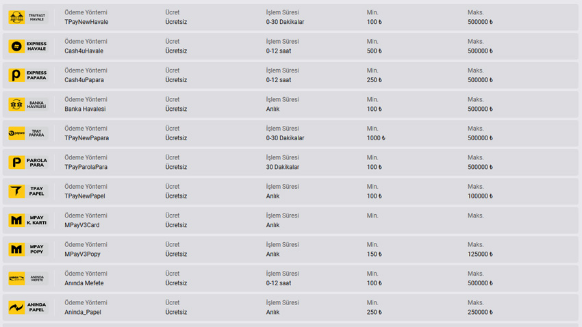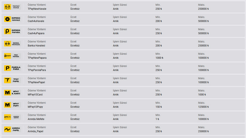 - Banka Havalesi / EFT: Klasik yöntemleri tercih edenler için banka havalesi seçeneği mevcut. Minimum yatırım tutarı 250 TL, maksimum tutar ise 250.000 TL olarak belirtilmiştir. Anında Havale ve TPayFast gibi hızlı havale çözümleri de bulunuyor ve bunlarda da genellikle 50 TL ile 000 TL arasında işlem yapılabiliyor.